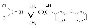 【化學(xué)名稱】:(RS)-a-氰基-3-苯氧基芐基(1RS,3RS;1RS,3SR)-3-(2,2-二氯乙烯)-2,2-二甲基環(huán)丙烷羧酸酯;